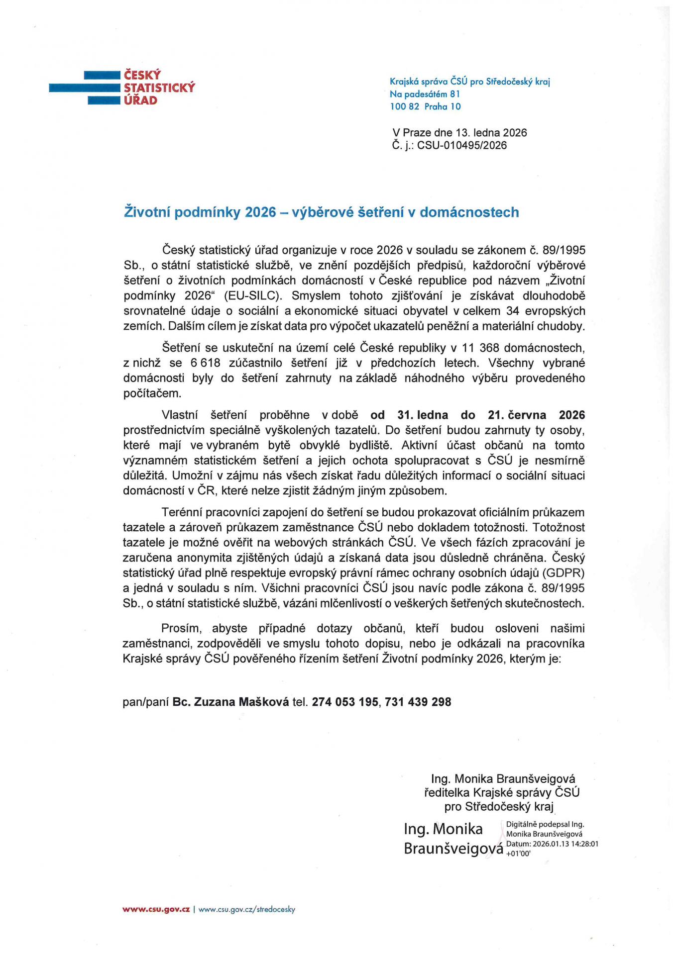Vaše případné dotazy zodpoví pracovník Krajské správy ČSÚ, pověřený řízením šetření, kterým je paní Bc. Zuzana Mašková, tel. 274 053 195, 731 439 298