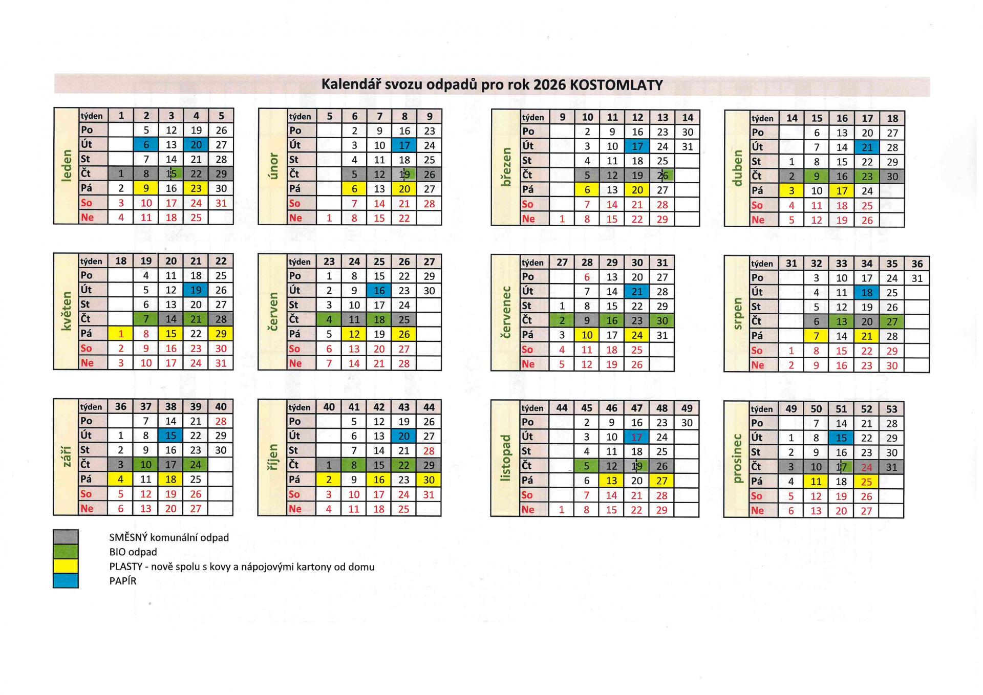Svozový kalendář v papírové podobě je součástí prosincového čísla Kostomlatských novin, zde je možné ho stáhnout v elektronické podobě.