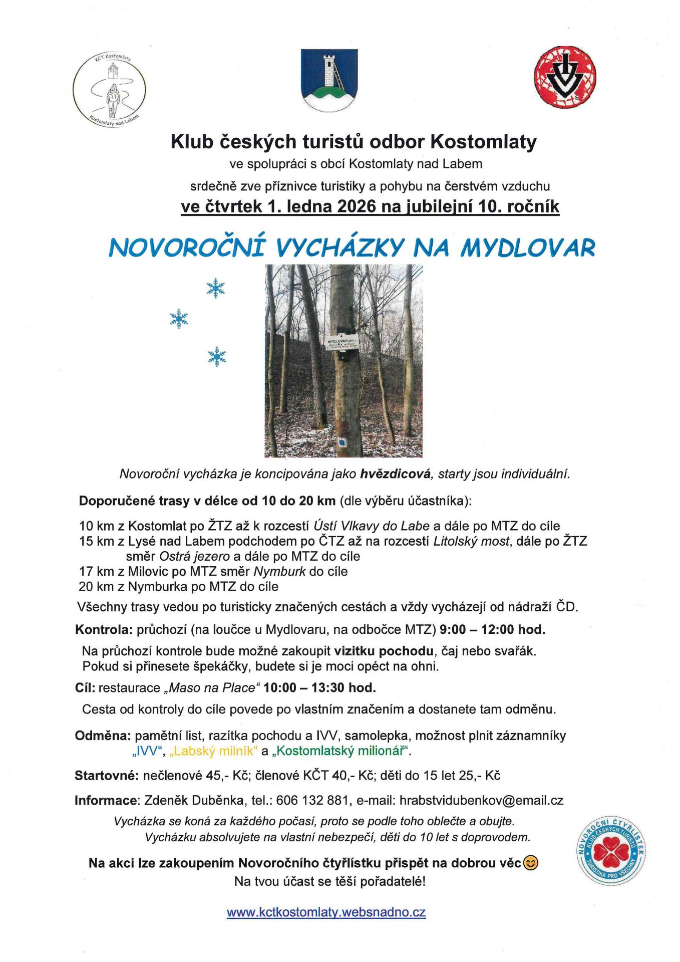 Klub českých turistů, odbor Kostomlaty, ve spolupráci s obcí Kostomlaty nad Labem srdečně zve příznivce turistiky a pohybu na čerstvém vzduchu na jubilejní 10. ročník NOVOROČNÍ VYCHÁZKY NA MYDLOVAR - ve čtvrtek, 1. ledna 2026.
