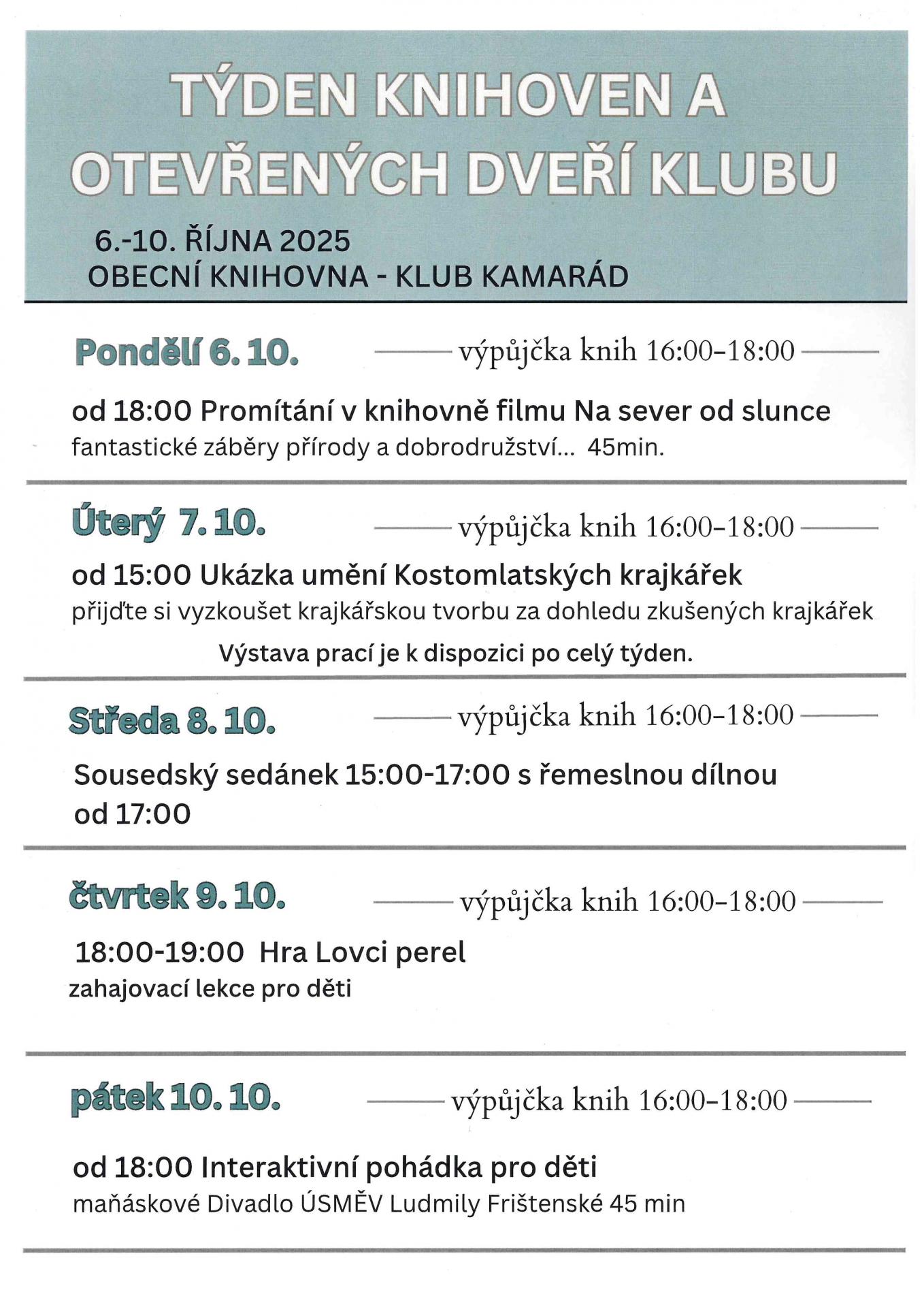 Obecní knihovna Kostomlaty Vás zve na Týden knihoven od 6. do 10. října. Po celý týden bude od 16.00 do 18.00 hodin fungovat výpůjčka knih a je připraven další doprovodný program.