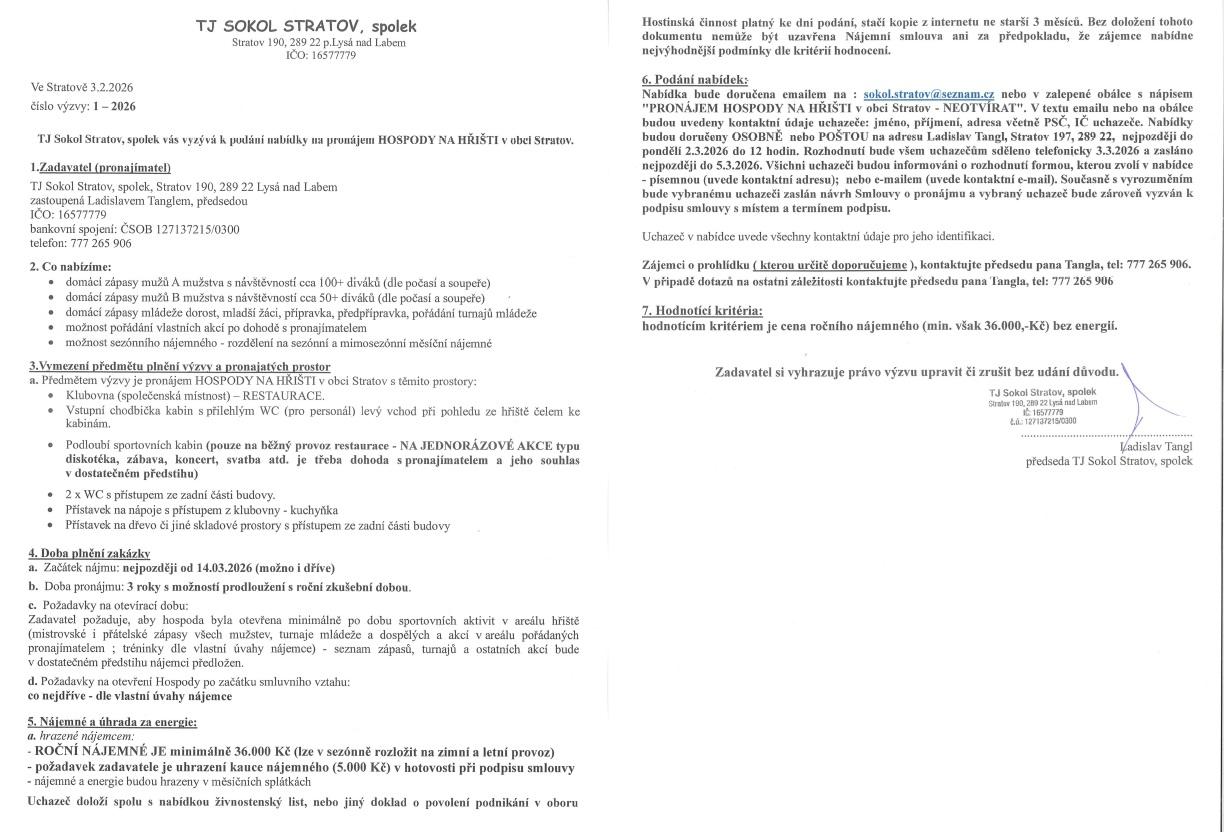 Pronajímatelem hospody je TJ Sokol Stratov, spolek, uzávěrka přihlášek je 2.3.2026. Více informací naleznete v příloze.