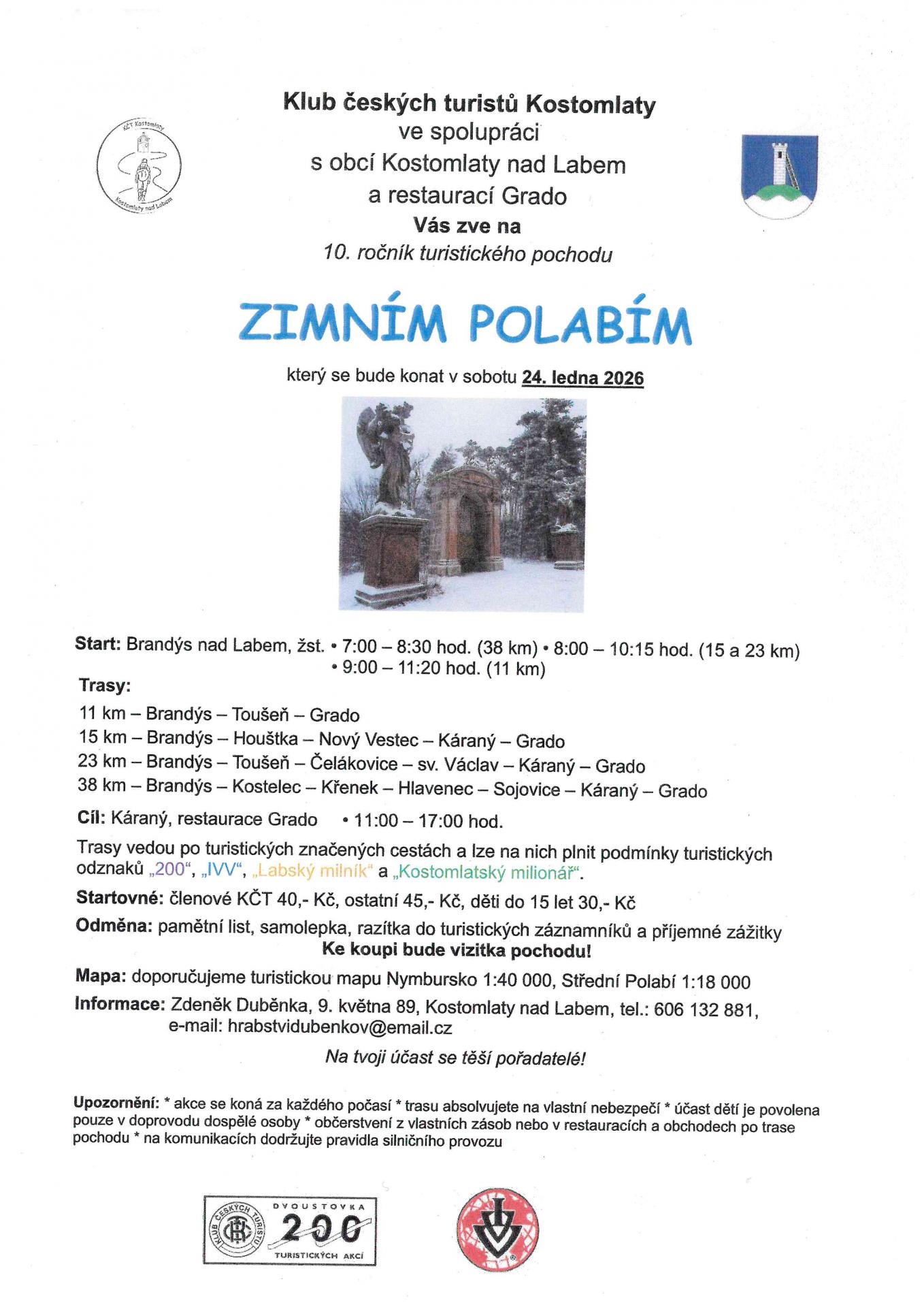Klub českých turistů Kostomlaty ve spolupráci s obcí Kostomlaty nad Labem a restaurací Grado Vás zve na 10. ročník turistického pochodu ZIMNÍM POLABÍM, který se bude konat v sobotu, 24. ledna 2026.